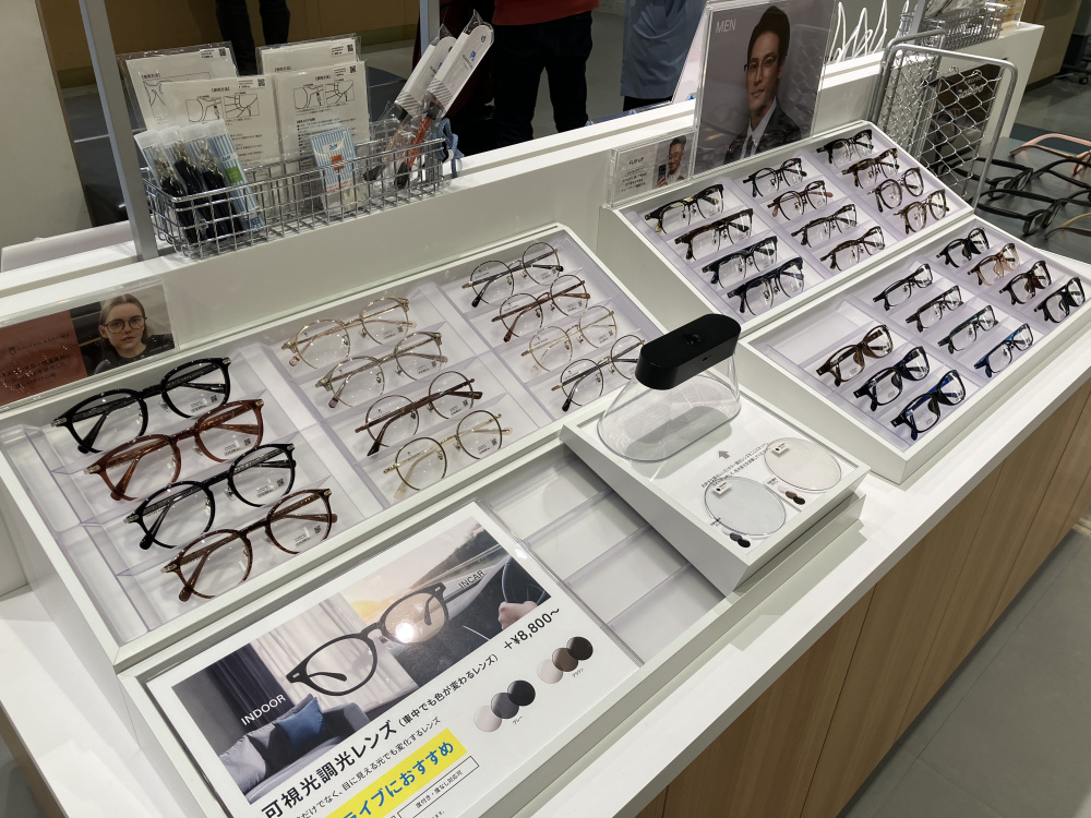 Once you step into the store, you can find various kinds of glasses for nearsightedness, farsightedness, sunglasses, reading glasses, and functional lenses such as blue light cut, glare-reducing, photochromic, colored, and more!